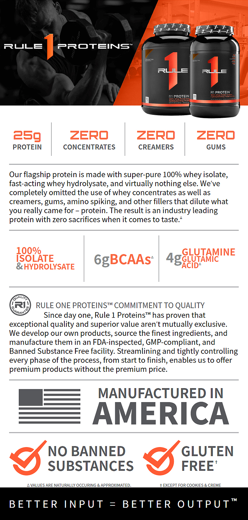 R1 PROTEIN ULTRA PURE ISOLATE/HYDROLYSATE FORMULA Those who are serious about getting the best out of lifting are obsessed with 1 thing. Protein. And a quick comparison of top-selling brands shows R1 PROTEIN delivers more of what we all take protein for...protein! WHAT EXACTLY GOES INTO BETTER PROTEIN? • An 87% protein ratio* - vs. top-sellers, this is AWESOME • Pure Whey Protein Isolate = 90%+ of our dual-protein formula • 6g+ of BCAAs per 25g protein serving - one of the best available • 100% instantized to ensure easy mixing even in cold liquids • Spray-dried flavors for deeper, richer flavors that don t fade • ZERO concentrates simply means better input ♦ ZERO sugar ♦ ZERO fat* ♦ ZERO lactose* ♦ ZERO gluten* ♦ ZERO gums ♦ ZERO creamers ♦ ZERO fillers ♦ ZERO spiking ♦ The frist rule in bodybuilding? input = Output. including the nutrition you put into your body. Our scientific blend provides one of the purset, most rapidly digested fuels Ultra Pure Whey Protein Isolate >Instantized Micro Fitered and Ion Exchanged Whey Protein Isolate, yielding 90%+ protein! >Fast acting Whey Protein feeds muscle recovery. >90%+ Whey Protein Isolate has Little-to-no Lactose or fat. Pure Whey Protein Hydrolysate >Ultra-pure, hydrolyzed Whey Protein Isolates. >Considered the fastest, purest from of protein available. Branched Chain Amino Acids >One serving of R1 PROTEIN contains over 6 grams of BCAAs! >Play a key role in protein metabolism. >BCAAs for protein synthesis. Glutamine >Over 4 grams of glutamine/glutamic acid per serving. >Glutamine for muscle recovery & protection. |