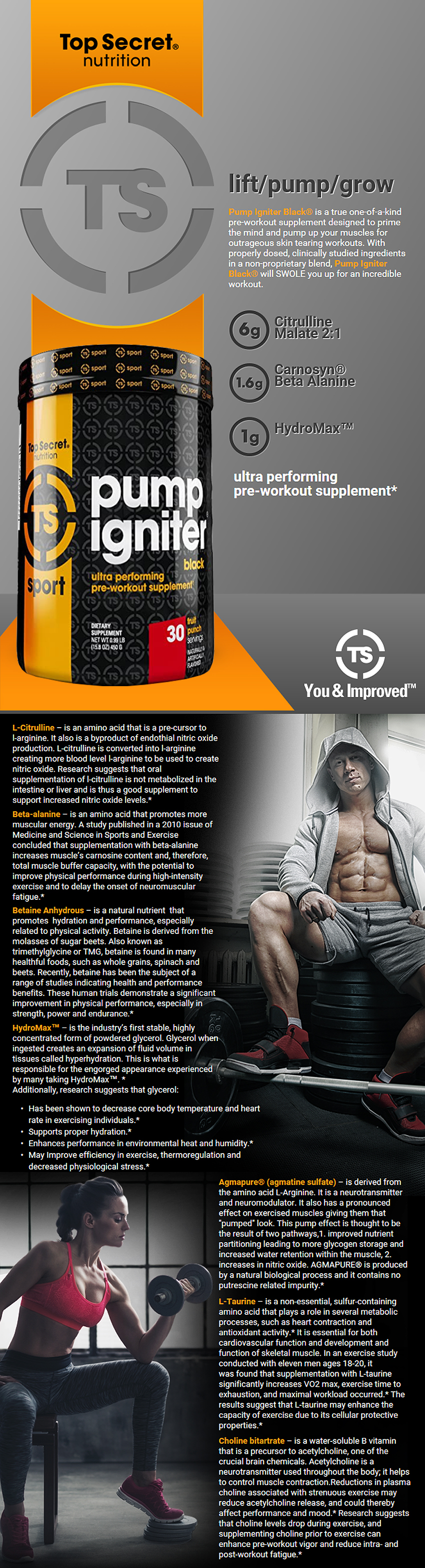 lift/pump/grow Pump Igniter Black® is a true one-of-a-kind pre-workout supplement designed to prime the mind and pump up your muscles for outrageous skin tearing workouts. With properly dosed, clinically studied ingredients in a non-proprietary blend, Pump Igniter Black® will SWOLE you up for an incredible workout. Watermelon Extract 2:1 Carnosyn® Beta Alanine HydroMax™ Glycerol ultra performing Watermelon Extract – is an amino acid that is a pre-cursor to l-arginine. It also is a byproduct of endothial nitric oxide production. Watermelon Extract is converted into l-arginine creating more blood level l-arginine to be used to create nitric oxide. Research suggests that oral supplementation of Watermelon Extract is not metabolized in the intestine or liver and is thus a good supplement to support increased nitric oxide levels.* Beta-alanine – is an amino acid that promotes more muscular energy. A study published in a 2010 issue of Medicine and Science in Sports and Exercise concluded that supplementation with beta-alanine increases muscle’s carnosine content and, therefore, total muscle buffer capacity, with the potential to improve physical performance during high-intensity exercise and to delay the onset of neuromuscular fatigue.* Betaine Anhydrous – is a natural nutrient that promotes hydration and performance, especially related to physical activity. Betaine is derived from the molasses of sugar beets. Also known as trimethylglycine or TMG, betaine is found in many healthful foods, such as whole grains, spinach and beets. Recently, betaine has been the subject of a range of studies indicating health and performance benefits. These human trials demonstrate a significant improvement in physical performance, especially in strength, power and endurance.* HydroMax™ – is the industry’s first stable, highly concentrated form of powdered glycerol. Glycerol when ingested creates an expansion of fluid volume in tissues called hyperhydration. This is what is responsible for the engorged appearance experienced by many taking HydroMax™. * Agmapure® (agmatine sulfate) – is derived from the amino acid L-Arginine. It is a neurotransmitter and neuromodulator. It also has a pronounced effect on exercised muscles giving them that "pumped" look. This pump effect is thought to be the result of two pathways,1. improved nutrient partitioning leading to more glycogen storage and increased water retention within the muscle, 2. increases in nitric oxide. AGMAPURE® is produced by a natural biological process and it contains no putrescine related impurity.* L-Taurine – is a non-essential, sulfur-containing amino acid that plays a role in several metabolic processes, such as heart contraction and antioxidant activity.* It is essential for both cardiovascular function and development and function of skeletal muscle. In an exercise study conducted with eleven men ages 18-20, it was found that supplementation with L-taurine significantly increases VO2 max, exercise time to exhaustion, and maximal workload occurred.* The results suggest that L-taurine may enhance the capacity of exercise due to its cellular protective properties.* Choline bitartrate – is a water-soluble B vitamin that is a precursor to acetylcholine, one of the crucial brain chemicals. Acetylcholine is a neurotransmitter used throughout the body; it helps to control muscle contraction.Reductions in plasma choline associated with strenuous exercise may reduce acetylcholine release, and could thereby affect performance and mood.* Research suggests that choline levels drop during exercise, and supplementing choline prior to exercise can enhance pre-workout vigor and reduce intra- and post-workout fatigue.* |