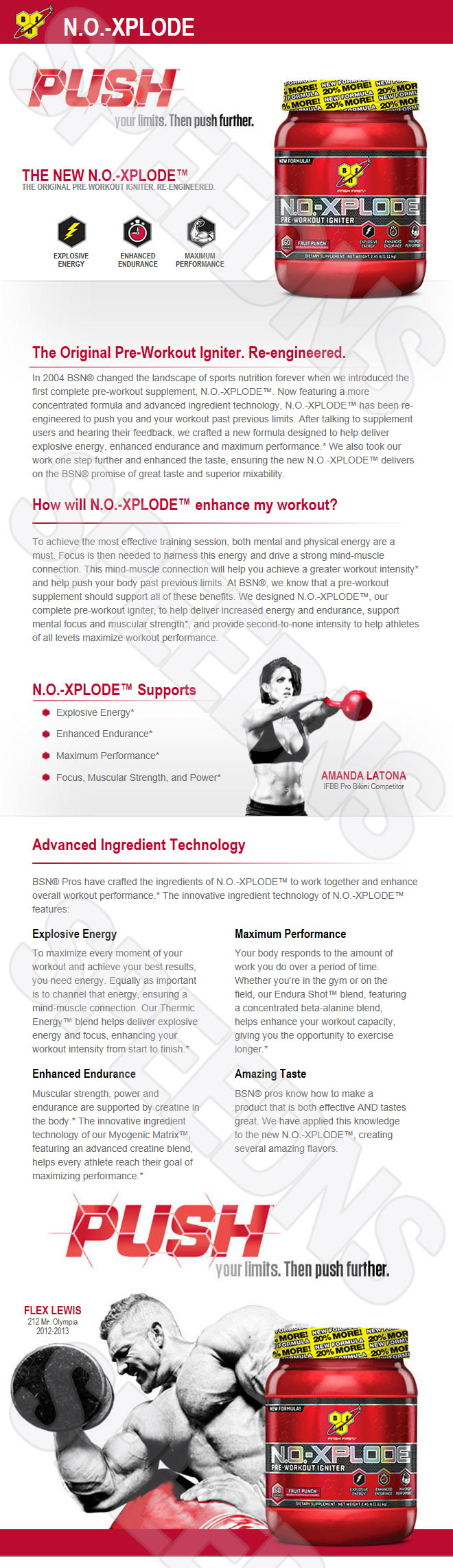 N.O.-XPLODE™ Supports Explosive Energy* Enhanced Endurance* Maximum Performance* Focus, Muscular Strength, and Power* AMANDA LATONA IFBB Pro Bikini Competitor Advanced Ingredient Technology divider BSN® Pros have crafted the ingredients of N.O.-XPLODE™ to work together and enhance overall workout performance.* The innovative ingredient technology of N.O.-XPLODE™ features: Explosive Energy To maximize every moment of your workout and achieve your best results, you need energy. Equally as important is to channel that energy, ensuring a mind-muscle connection. Our Thermic Energy™ blend helps deliver explosive energy and focus, enhancing your workout intensity from start to finish.* Enhanced Endurance Muscular strength, power and endurance are supported by creatine in the body.* The innovative ingredient technology of our Myogenic Matrix™, featuring an advanced creatine blend, helps every athlete reach their goal of maximizing performance.* Maximum Performance Your body responds to the amount of work you do over a period of time. Whether you’re in the gym or on the field, our Endura Shot™ blend, featuring a concentrated beta-alanine blend, helps enhance your workout capacity, giving you the opportunity to exercise longer.* Amazing Taste BSN® pros know how to make a product that is both effective AND tastes great. We have applied this knowledge to the new N.O.-XPLODE™, creating several amazing flavors |