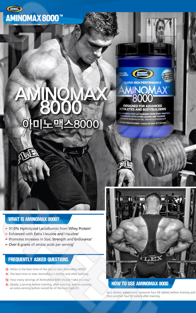 Gaspari Nutrition’s AMINOMAX 8000 is a scientifically designed blend of 91% hydrolyzed lactalbumin from whey protein, containing very low molecular weight proteins, di- and tripeptides and individual amino acids infused with additional L-Leucine and L-Taurine, proven to be exceedingly beneficial to all types of athletes and bodybuilders. This unique, innovative formula provides the educated consumer with a highly useful and bioavailable product that delivers a broad array of the very building blocks you must have to grow and maintain
